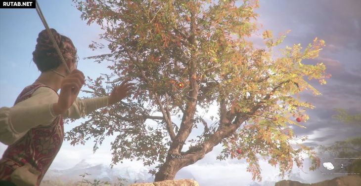 Подберите камни возле ствола и подойдите к яблоне, чтобы начать метать из пращи.