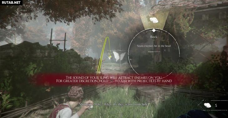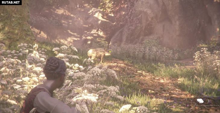 Поскольку это ваш единственный предмет инвентаря, Амиция уже должна иметь экипированные камни. Вы можете найти камни, лежащие вокруг области. Будучи невидимым, цельтесь в голову кабана. Отец Амиции поздравляет ее с выстрелом, но кабан еще не сбит, и Лион следует за ним.
