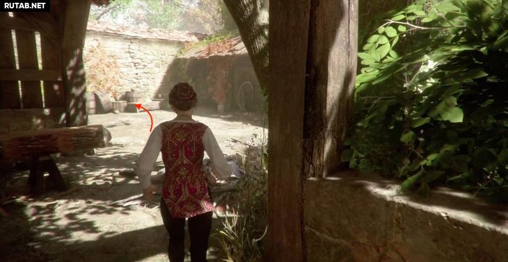 В третьей области возьмите камни на скамейке и нацельтесь на металлические части брони в середине двора, чтобы отвлечь ближайшего охранника. Охранник пойдет, чтобы исследовать шум, и вы можете незаметно пройти.