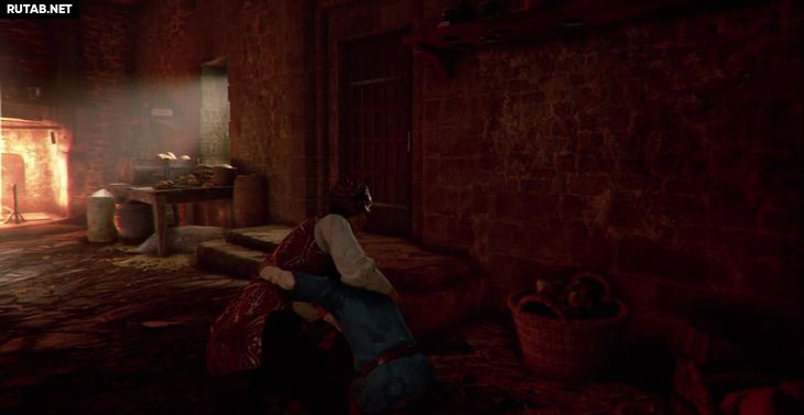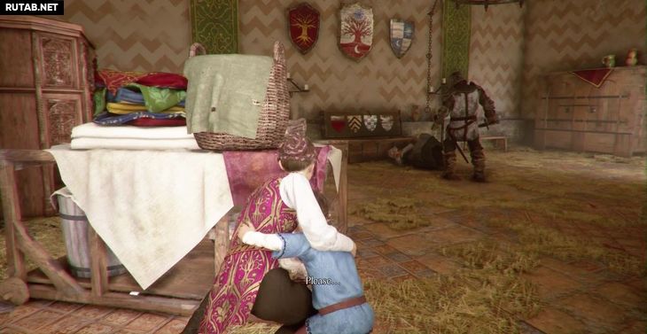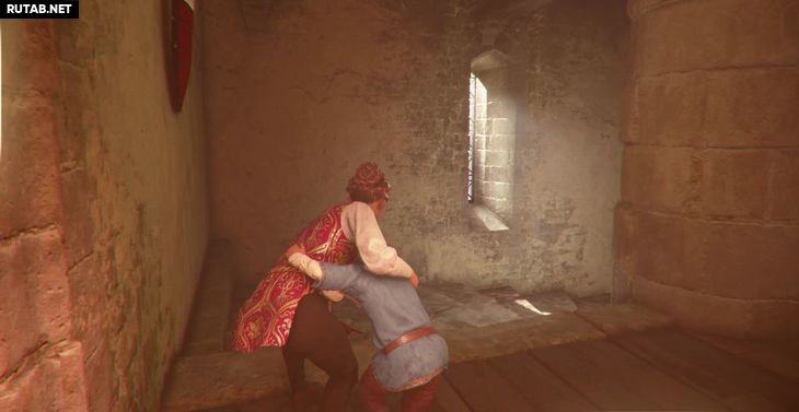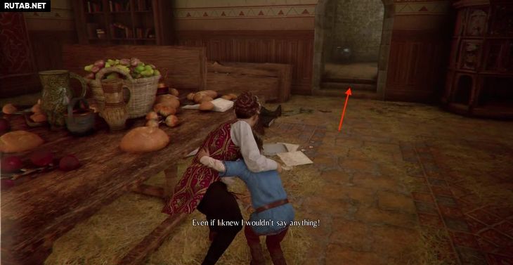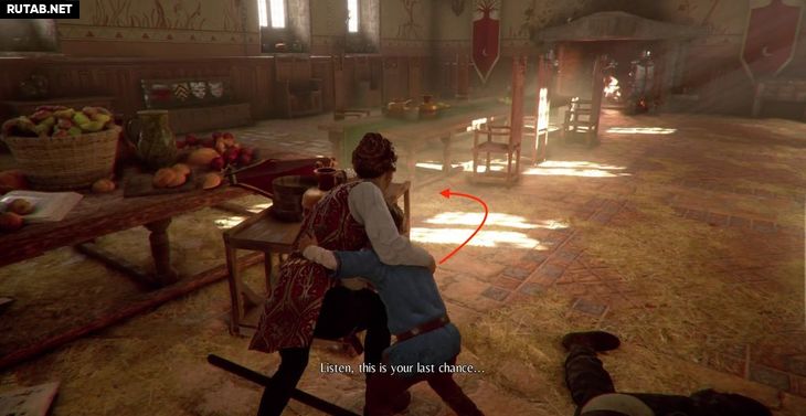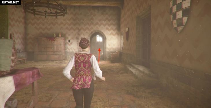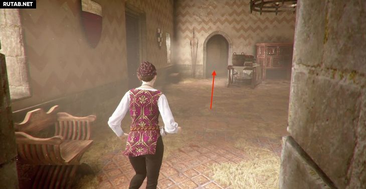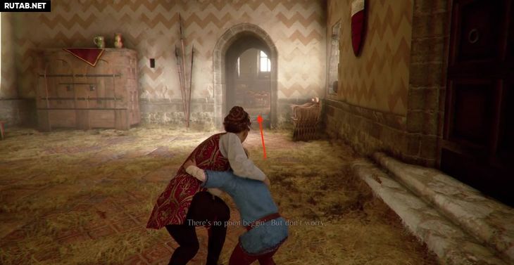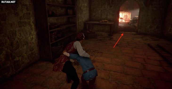 Подождите, пока человек, убитый копьем, не упадет на пол и проскользните мимо охранников, когда они находятся у камина, пытая другого мирного жителя, и продолжайте идти назад и направьтесь в комнату с другим камином и горшком.