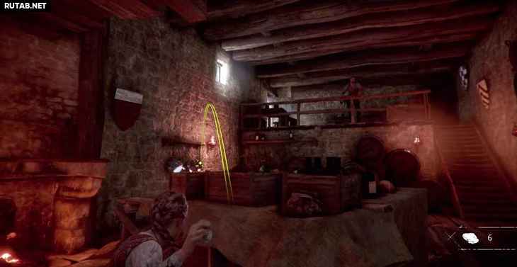 Дом, однако, патрулируется, и для того, чтобы продвинуться вперед, нам нужно отвлечь охранника. Возьмите камень и бросьте его в горшки на стене. Когда охранник поворачивается к вам спиной, поднимитесь по лестнице и выйдите через дверь.