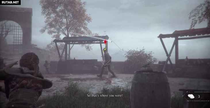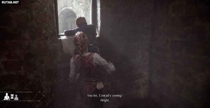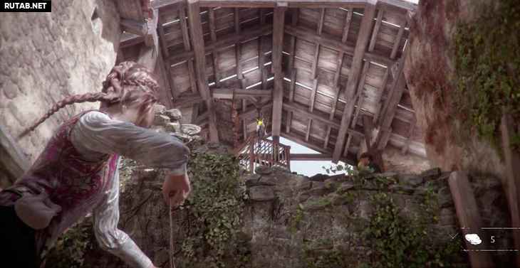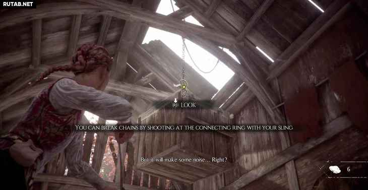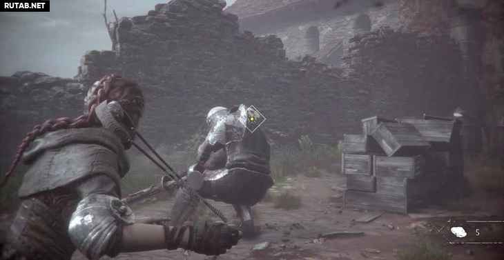 Когда Амиция приносит свои извинения, охранник преследует Гуго. Быстро экипируйте пращу и убейте врага камнем.
