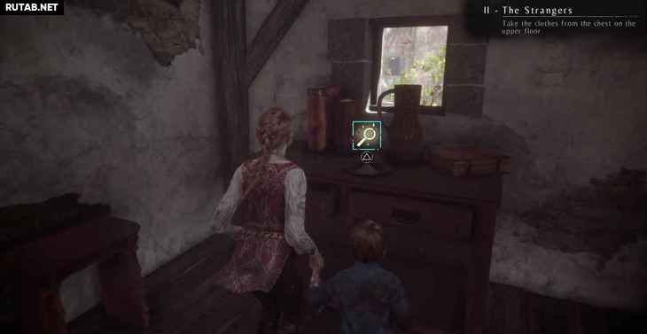 Старушка даже дает нам немного сухой одежды. Такая щедрость! Поднимитесь наверх и возьмите одежду из сундука, чтобы Амиция и Гуго могли переодеться. Пока вы здесь, возьмите Коллекционный предмет (Благовония и травы - Диковинка 4) ,