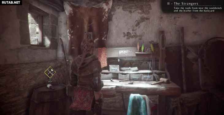 Теперь выйдите на задний двор и возьмите кусок кожи на вершине кучи в левом углу области.