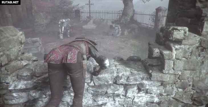Затем пройдите через сломанные ворота, поднимитесь по лестнице и, наконец, взберитесь на стену.