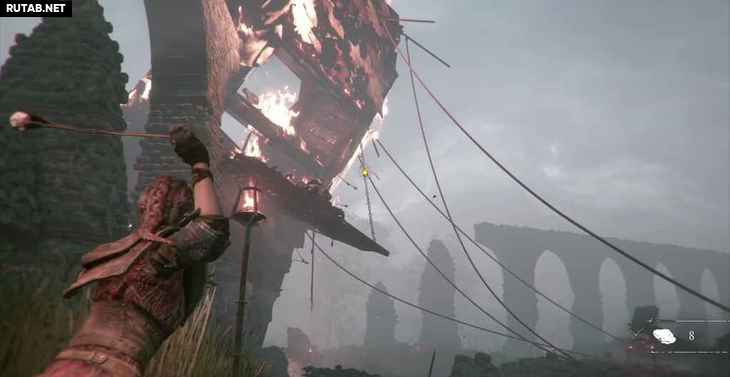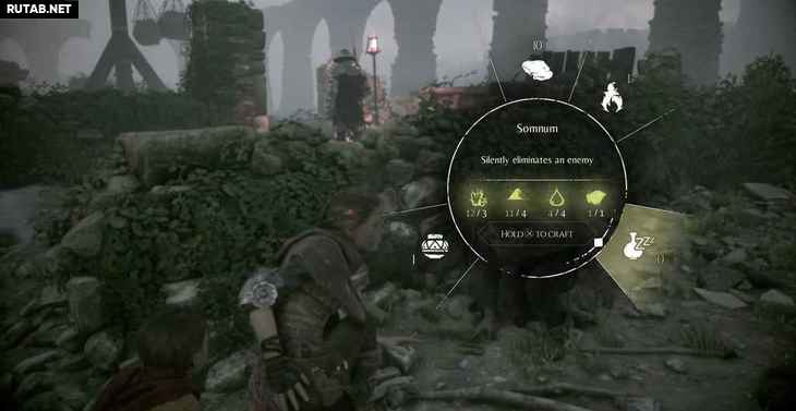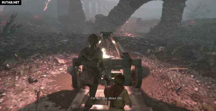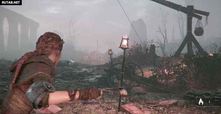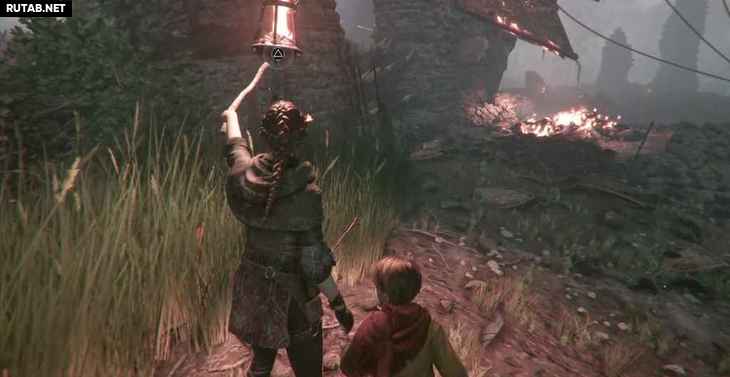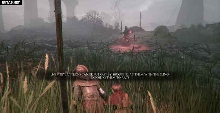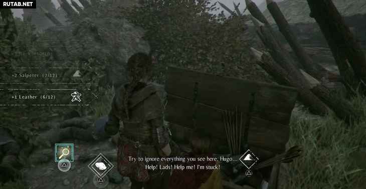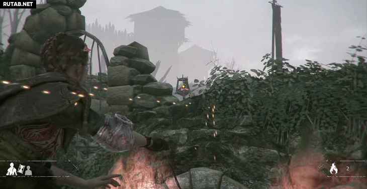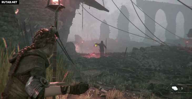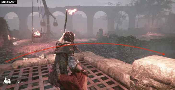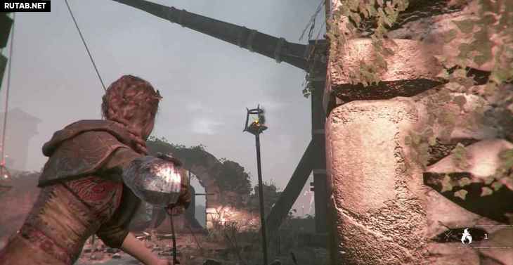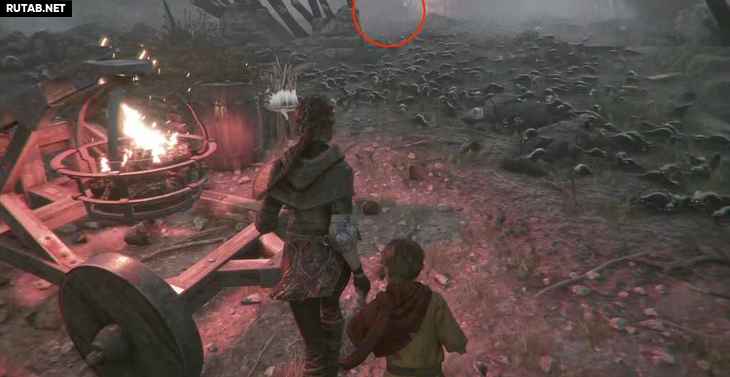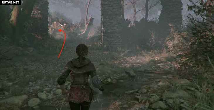 Амиции и Гуго удалось избежать огня и полчищ крыс с фермы Лаврентия. Рядом с ними Лукас, ученик алхимика, который вызвался использовать свои знания алхимии, чтобы облегчить путешествие Амиции и Гуго в замок. Когда они пересекают озеро, Амиция спрашивает Лукаса, что у Гуго в его крови. Лукас говорит, что на Гуго может повлиять Прима Макула, редкое заболевание, протекающее в крови некоторых семей, которое, похоже, пробудилось в крови Гуго, когда разразился Великий прорыв, чума. Продолжая наше путешествие, Прима Макула будет играть главную роль в жизни Гуго. Время пробираться к акведуку. Это, кажется, самый безопасный и быстрый способ добраться до Chateau d'Ombrage. Первое, о чем нужно позаботиться – Коллекционный предмет (Цветы 3 - Гладиолус) . Начните идти в направлении акведука, и когда вы приблизитесь к нему, поверните налево. Путь является линейным и в конце будет коллекционный предмет. Теперь вернитесь назад и продолжайте движение под акведуком, пока не доберетесь до огромного поля битвы. По полю битвы разбросаны бесчисленные трупы людей, которые погибли в битве или стали жертвами чумы. Амиция, Гуго и Лукас не имеют большого выбора, они должны идти. Вскоре место будет кишеть крысами. Зажгите жаровню под упавшим сундуком и сделайте то же самое для ближайшего. Продолжайте бегать от одного факела к другому, используя при необходимости воспламенитель на них. Продолжайте, пока не дойдете до большой деревянной конструкции с двумя маневренными ручками. Найдите и используйте воспламенитель на вершине большого деревянного столба, затем используйте ручки с Лукасом, чтобы опустить его, чтобы создать путь для Гуго. Гуго пойдет и схватит палку. Используйте жаровню рядом с вами, чтобы зажечь палку и продолжить. Вы достигнете травы. Спрячьтесь в ней, чтобы не быть замеченным ближайшим охранником. Экипируйте камень и нацельтесь на фонарь, чтобы охранник уронил его. Крысы убьет охранника, и пока они пожирают тело, вы можете пройти дальше. Перейдите мост и в следующей освещенной зоне экипируйте воспламенитель, чтобы зажечь жаровню. Переместитесь рядом с жаровней и экипируйте камень, чтобы расцепить цепи и позволить разводному мосту упасть и убить крыс внизу. Экипируйте камень и выстрелите охраннику в голову. Войдите в деревянную башню и запаситесь крафт-материалами. Чтобы продолжить, поднимитесь по лестнице и бросьте снаряд воспламенитель на жаровню на телеге на расстоянии. Затем вернитесь назад и возьмите палку. Зажгите ее с помощью ближайшего факела и проберитесь к тележке. Теперь основной путь находится справа, но сначала мы должны идти налево, чтобы собрать Коллекционный предмет (Диковинка 9 - Измельчитель) . Подойдите к тележке и толкните ее влево. Если охранник с факелом заметит вас, прекратите толкать тележку на мгновение, экипируйте камень и выстрелите ему в голову. Затем идите дальше, коллекционный предмет находится в сундуке рядом с тем местом, где находится охранник. После того, как вы схватили коллекционный предмет, дайте крысам убить вас, чтобы легко вернуться к телеге. Не волнуйтесь, коллекционный предмет сохранен. На этот раз, толкните тележку вправо. Рядом охранник. Прекратите толкать тележку на мгновение, стреляйте в его фонарь и продолжайте, пока колеса не застрянут в грязи. Новые охранники патрулируют эту область, но для продолжени