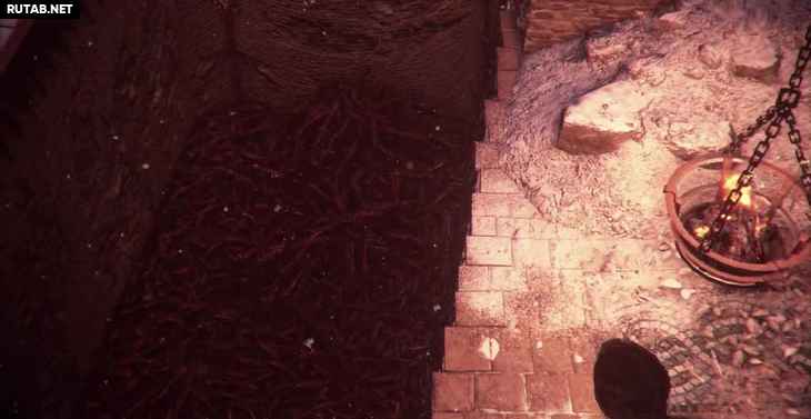 Затем быстро бросьте воспламенитель снова на следующую жаровню перед вами, когда вихрь крыс разрушит лестницу, с которой вы только что спустились.
