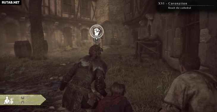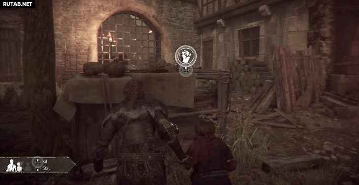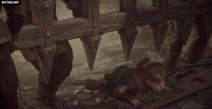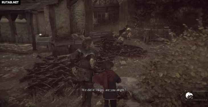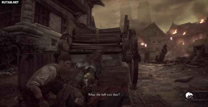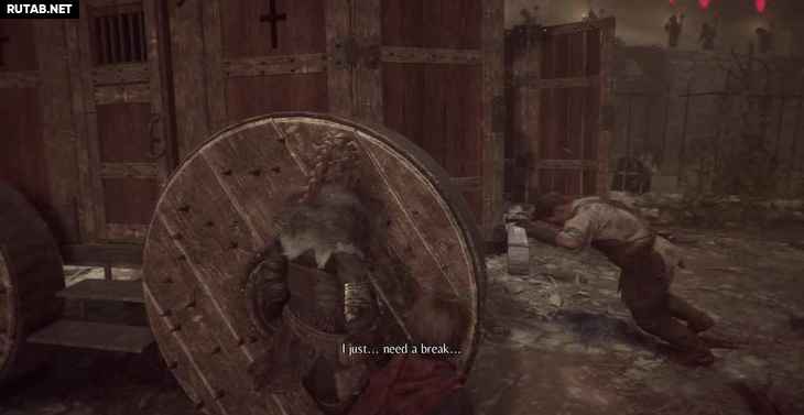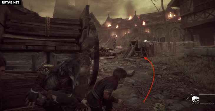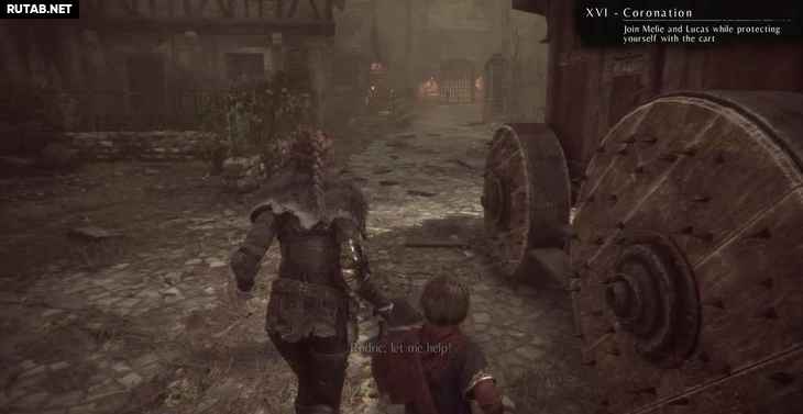 Вернитесь в область тележки и взаимодействуйте с ней. Родрик оттолкнет вас, добровольно отправив телегу для Амиции и Хьюго, несмотря на то, что лучники готовы ударить его.