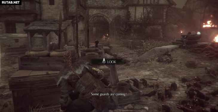 Теперь осталось только пара охранников. Когда охранники отвлечены, перейдите к следующему забору, как показано на рисунке ниже, и бросьте камень в лучника на расстоянии и Exstinguis в факел. Охранник должен быть предупрежден, просто направьте к нему крыс.