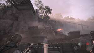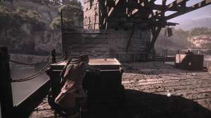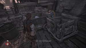 Взаимодействуйте с обломками, чтобы проползти под ними, а затем попытайтесь повернуть рукоятку. Это не удастся, поэтому вам нужно будет пролезть под стену на противоположной стороне здания и попросить Луку оттащить тележку назад, что позволит вам спрыгнуть в воду.