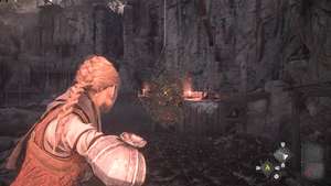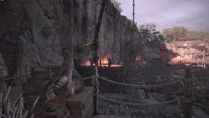 Спрыгните с уступа поблизости и переместите обломки вправо, чтобы протиснуться через щель. Когда вы спрыгнете с деревянной платформы, появится рой крыс. Найдите ресурсы в сундуке позади вас, используйте Воспламенитель Пращу, чтобы зажечь стог сена, и быстро бегите и запрыгивайте на следующую деревянную конструкцию впереди вас.