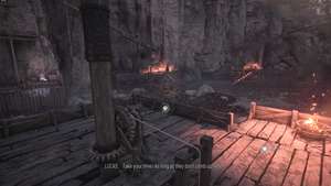 Поверните рукоятку до упора, затем быстро зажгите тюк сена с помощью Воспламенителя и следуйте за ним, чтобы подняться на следующую платформу. Возьмите палку из связки и бросьте ее Луке справа, и подождите, пока он перейдет.