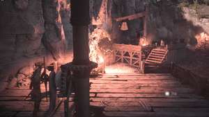 Вернитесь вниз по лестнице к платформе, где находится верстак, и как только вы закончите модернизацию, возьмите палку из связки, зажгите ее и идите вниз по ступенькам и налево.