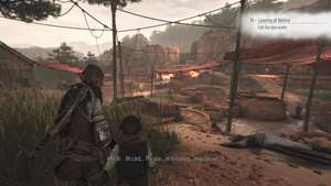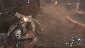 Затем разберитесь с дополнительными солдатами, которые присоединятся к битве (затем можно выстрелить в голову из пращи), сохраняя при этом расстояние от Зверя. Чтобы быстро закончить бой, ударьте банку со смолой об землю, пока Зверь находится рядом с ним с горящим цепом, чтобы сжечь его до смерти.