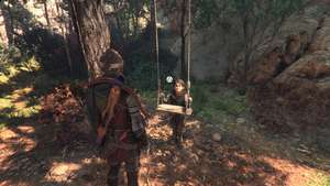 Войдите в него и в начальной круглой области найдите с левой стороны человека, стоящего между двумя палатками. Пройдите мимо него, чтобы найти качели в конце пути. Взаимодействуйте с качелями, чтобы получить следующий сувенир: представьте, что вы летите!