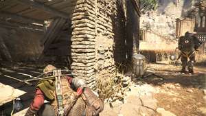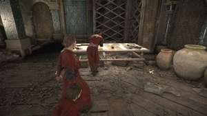 Прокрадитесь вперед, отвлекая охранников по мере необходимости, и обыщите два сундука в этом районе, если вам не хватает припасов. Пройдите через дверь справа от больших ворот, чтобы найти небольшой сундук и верстак в комнате справа. Перемещайтесь по внешней стороне моста, а затем идите вперед по ступенькам, чтобы войти в другую стелс-секцию.