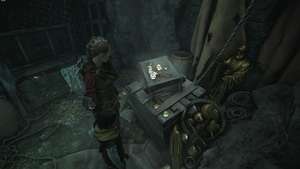 Следуйте по тропе через пещеру до конца, чтобы найти два больших сундука с Инструментом, Частями и дополнительными ресурсами. Между двумя сундуками на бочке находится наруч, который навсегда улучшает способность Амиции восстанавливаться после вражеских атак.