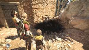 Продолжайте идти по дорожке мимо пчеловодов к арочным воротам. Вы можете подняться к нему с левой стороны, с большим сундуком с инструментом, некоторыми частями и ресурсами наверху.