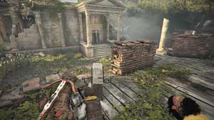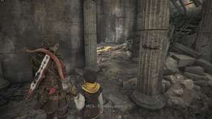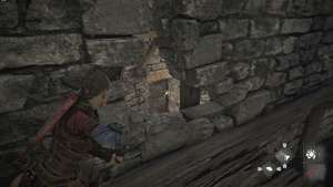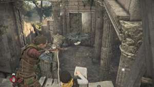 Пройдите в разрушенное здание впереди, затем поверните налево и найдите опорную точку. Пройдите через арку и используйте опорную точку, чтобы опустить деревянную конструкцию через комнату.