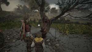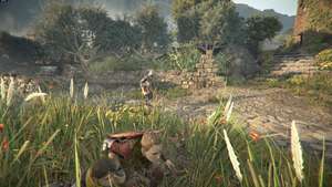 Войдите в здание справа от вас, опасаясь патрулирующего охранника, и выпрыгните из дальнего окна. Если хотите, возьмите палку из связки, подожгите ее от пылающего котла на стене и обойдите здание сбоку, чтобы найти сундук с Частями и дополнительными ресурсами, а также Горшок и месторождение Эписангуиса.