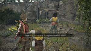 Затем используйте опорную точку, чтобы выстрелить из арбалета в дверь храма и опустить ее.