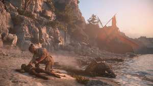 Когда вы получите контроль над Амицией на берегу, идите вперед с Арно и протиснитесь через щель в скалах, чтобы добраться до обломков Racasse. Граф там, и Арно начинает сражаться с ним, чтобы узнать местонахождение Гуго, пока вы его защищаете.