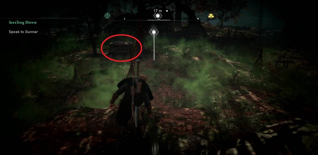 Здесь вам предстоит бродить в ядовитом зеленом тумане, будьте готовы. Двигайтесь на далеко вниз и влево по региону. Как раз недалеко от места с меткой должен быть монастырь. На локации будет темно, поэтому внимательно осматривайтесь в поисках проклятия.