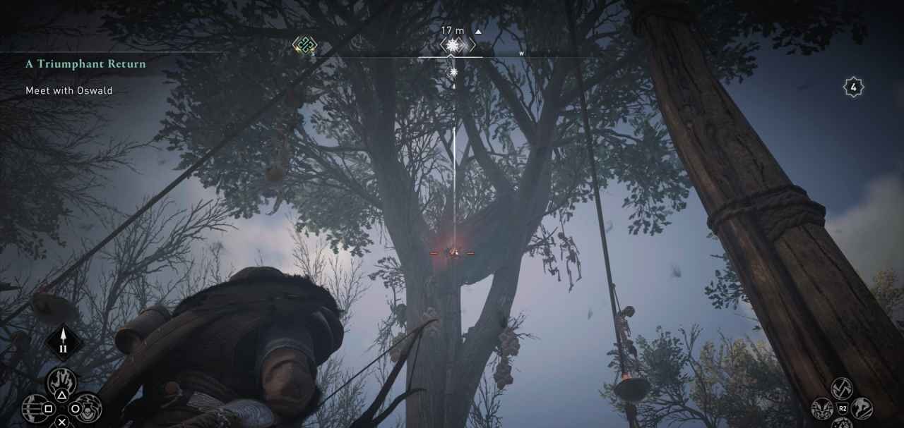 Все масимально просто и также сложно, как и всегда в ситуации с символами: стреляйте в усохшую голову, которую вы найдете среди веток большого дерева. Вокруг него натянуты веревки, и можно увидеть скелетов-висельников.