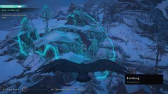 Поднимитесь к точке синхронизации и выполните синхронизацию, нажав Треугольник / Y. Здесь вы увидите три оранжевых маркера, белый и бирюзовый. Оранжевый маркер указывает на коллекционные предмет состояние, белый маркер - на артефакт, а бирюзовый маркер - на тайну. Вы можете собирать их по мере продвижения по региону, но мы собираемся направиться к маркеру главной цели - бирюзовому значку с вопросительным знаком внутри - в этот момент, чтобы Эйвор могла найти и спасти свою команду.
