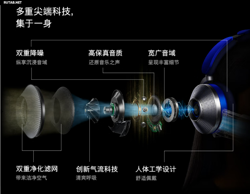 Наушники, оснащенные встроенным электростатическим фильтром, могут работать до 12 месяцев без замены. Конструкция двухслойного фильтра включает богатый калием уголь, который задерживает кислые газы, такие как диоксид азота, диоксид серы и озон. Dyson официально заявляет, что этот фильтр может блокировать 99% частиц, даже размером до 0,1 микрона.