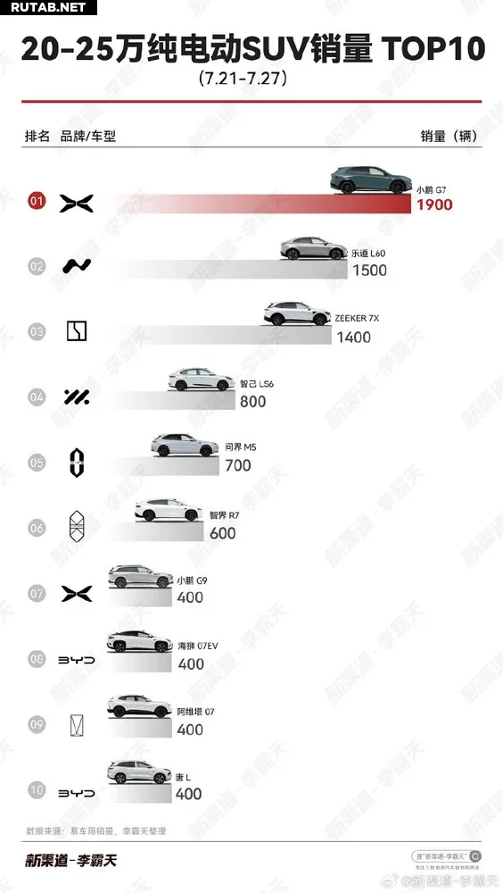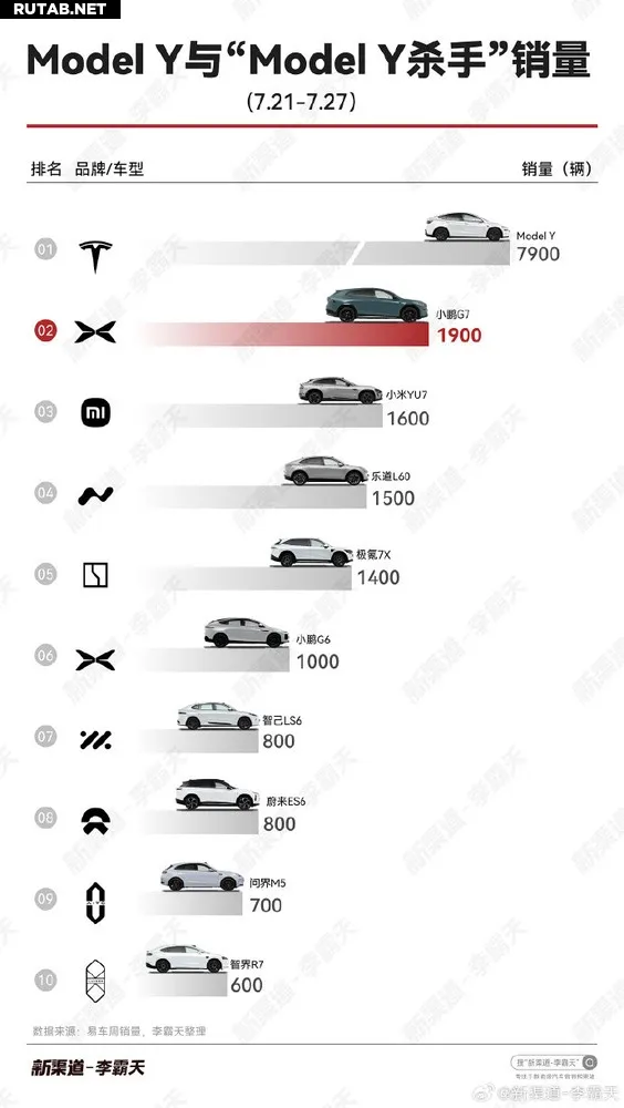 Автомобильный блогер опубликовал данные о продажах моделей, конкурирующих с Tesla Model Y, за 30-ю неделю. Лидером списка стал кроссовер Xpeng G7 с впечатляющим показателем в 1900 проданных экземпляров. Второе место занял Xiaomi YU7 с результатом в 1600 единиц.