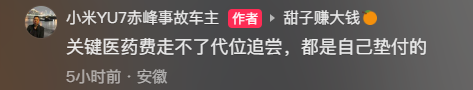 Однако владелец Xiaomi YU7 с сожалением отметил, что медицинские расходы, возникшие в результате аварии, не могут быть возмещены таким образом, и в настоящее время все медицинские расходы пострадавших оплачиваются им из собственных средств.