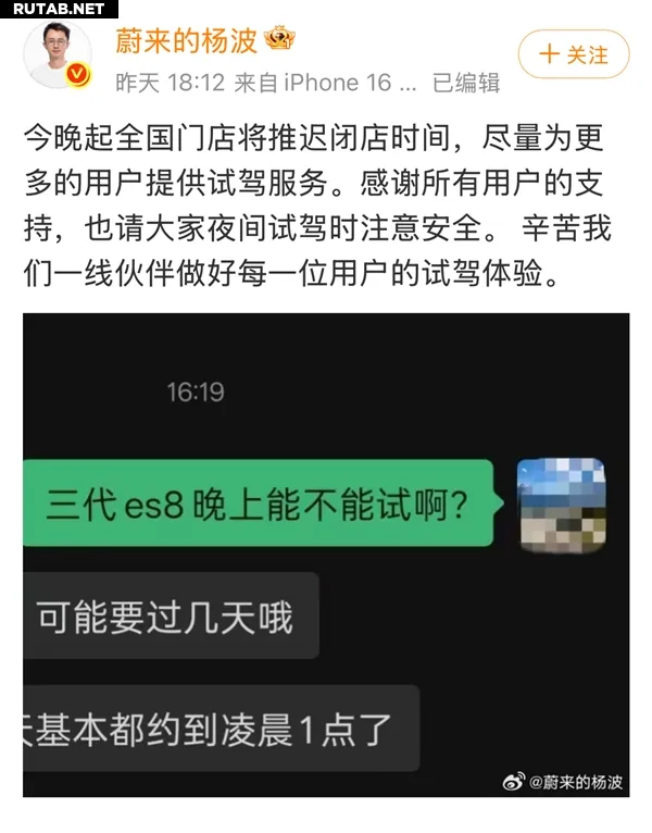 10 сентября Ян Бо, руководитель отдела по работе с пользователями NIO, написал в Weibo: «Начиная с сегодняшнего вечера, наши магазины по всей стране будут продлевать время работы, чтобы предоставить возможность тест-драйва как можно большему числу пользователей. Благодарим всех за поддержку и, пожалуйста, соблюдайте меры предосторожности во время ночных тест-драйвов».