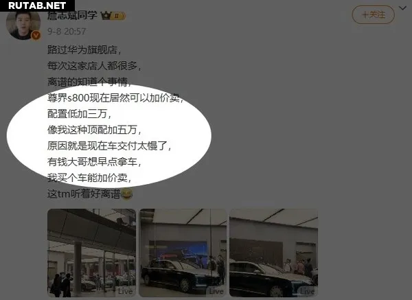На автомобильном рынке Китая наблюдается редкое явление: флагманский седан Zunjie S800 под брендом Hongmeng Intelligent Driving, который изначально продается по цене от 708000 до 1018000 юаней (от ~8,5 млн до ~12,2 млн рублей), на вторичном рынке продается с существенной наценкой.