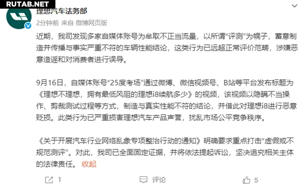В частности, компания указала на видео под названием «Идеал неидеален: какой запас хода у Li i8 с самым низким аэродинамическим сопротивлением?», опубликованное 16 сентября автором «25度考场» (25 Degrees Test Field) на платформах Weibo, WeChat Video и Bilibili.