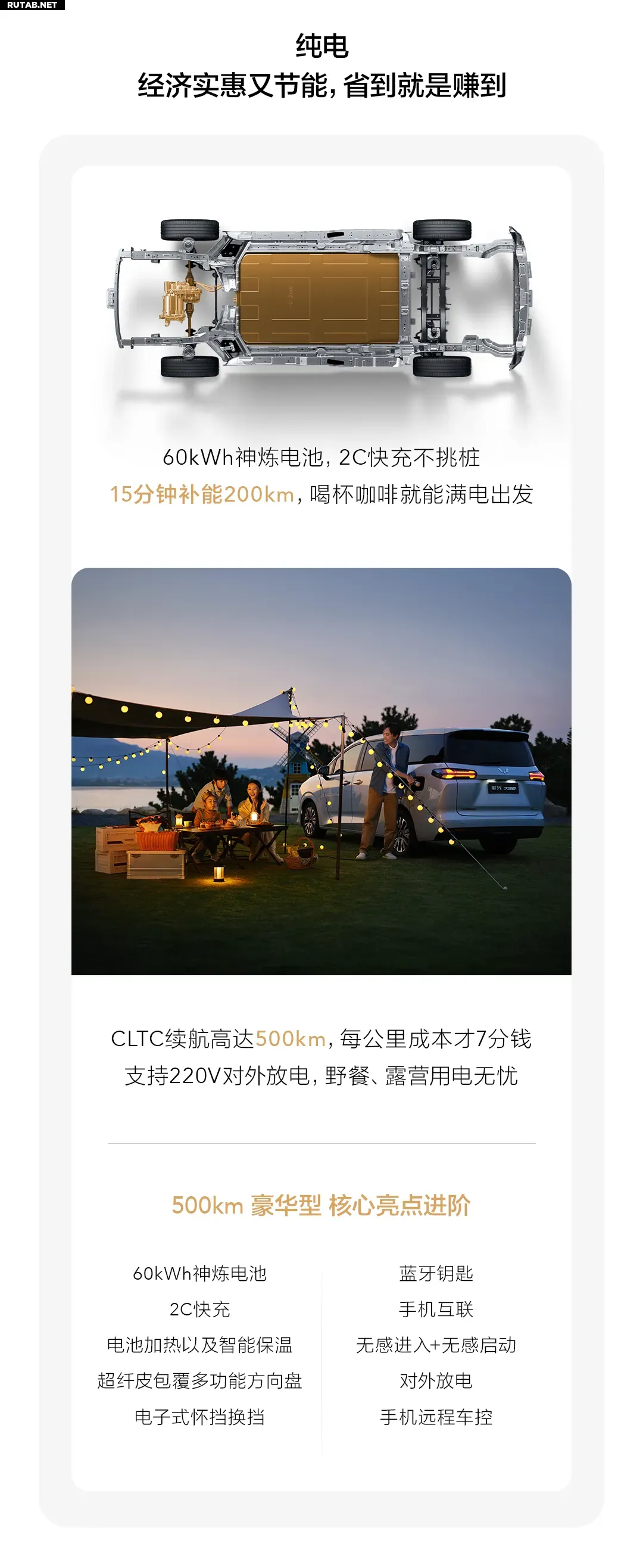 Электромобиль оснащён двигателем мощностью 100 кВт и батареей ёмкостью 60 кВт·ч. На одной зарядке он может проехать 500 км (CLTC). Поддержка зарядки 2C позволяет восстановить запас хода на 200 км за 15 минут. Также предусмотрена функция питания внешних устройств напряжением 220 В.