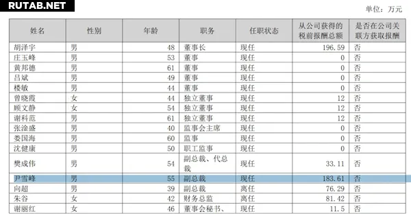 Председатель правления Ху Цзэюй получил от компании вознаграждение в размере 1,97 млн юаней до вычета налогов, а вице-президент Инь Сюэфэн — 1,84 млн юаней. Годовые зарплаты этих двух руководителей составили почти 40% от общего фонда оплаты труда всех директоров и высших менеджеров компании.