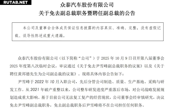 Китайский автопроизводитель Zotye Auto объявил об увольнении Инь Сюэфэна с должности вице-президента. Одновременно совет директоров компании назначил Хуан Банде новым вице-президентом на срок, совпадающий с полномочиями восьмого состава совета директоров.