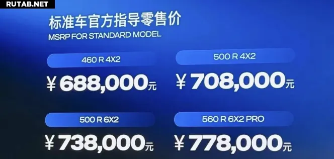 SUPER 500R 4x2 за 708 000 юаней комплектуется пневмоподвеской, электрогидравлическим усилителем руля и цифровыми экранами. Двигатель развивает 500 л.с. и 2650 Н·м.