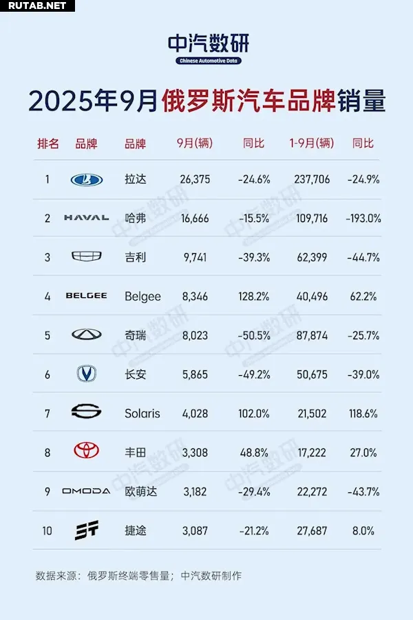 Китайский институт исследований автомобильных данных опубликовал рейтинг продаж автомобильных марок в России за сентябрь 2025 года.