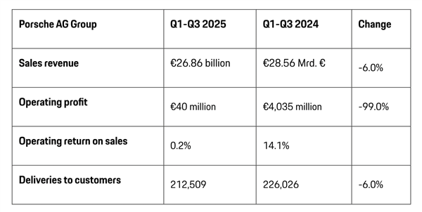 Прибыль Porsche от продаж за первые три квартала текущего года составила всего 40 миллионов евро, что на 99% меньше, чем 4,035 миллиарда евро за аналогичный период прошлого года.