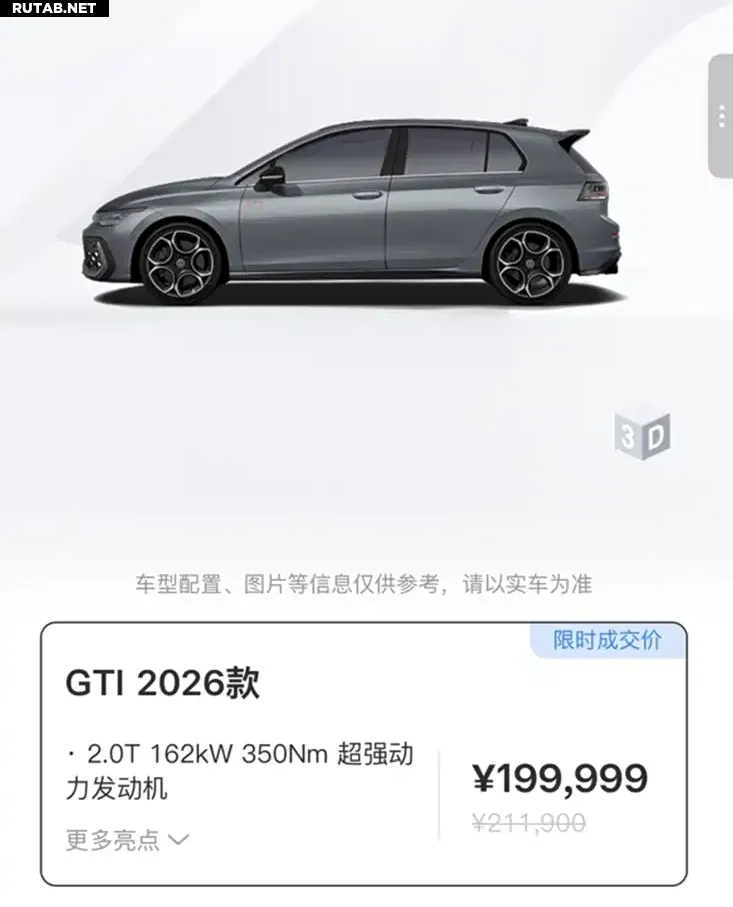 7 ноября компания FAW-Volkswagen официально представила Golf GTI 2026 года в одной комплектации по цене 211 900 юаней, а также по ограниченной по времени цене в 199 999 юаней.