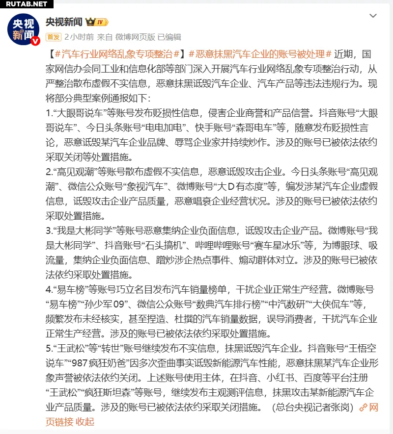 Были названы конкретные нарушители:微博-аккаунты «易车榜» (Yiche Bang), «孙少军09» (Сунь Шаоцзюнь), а также публичные аккаунты в WeChat «数典汽车排行榜» (Shudian Automotive Rankings), «中汽数研» (Zhongqi Shuyan) и «大侠侃车» (Daxia Kanche). Установлено, что они регулярно публиковали непроверенные, а зачастую и откровенно сфабрикованные данные о продажах автомобилей, вводя в заблуждение потребителей и disrupting деятельность автопроизводителей. В отношении этих аккаунтов были приняты соответствующие меры.
