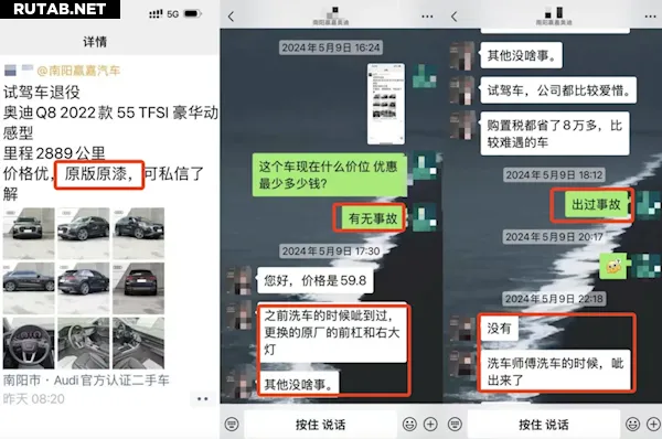 Владелец Audi Q8 Цинь рассказал, что потратил 580 000 юаней на покупку автомобиля в дилерском центре 4S, но при последующей продаже обнаружил, что машина ранее побывала в серьёзной аварии. Мужчина считает, что автосалон намеренно ввёл его в заблуждение.