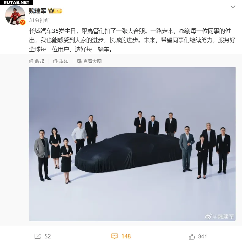 На праздновании 35-летия Great Wall в июле Вэй Цзяньцзюн опубликовал групповое фото высшего руководства компании, в центре которого был запечатлён тщательно укрытый брезентом автомобиль, угадывавшийся по силуэту как суперкар.