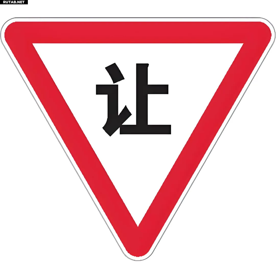 Дорожный знак в форме перевернутого треугольника с белым фоном, красной каймой и черным иероглифом «让» (уступите) в центре является знаком «Уступите дорогу». Увидев этот знак при приближении к перекрестку, водитель должен снизить скорость и уступить дорогу транспортным средствам, движущимся с других направлений.