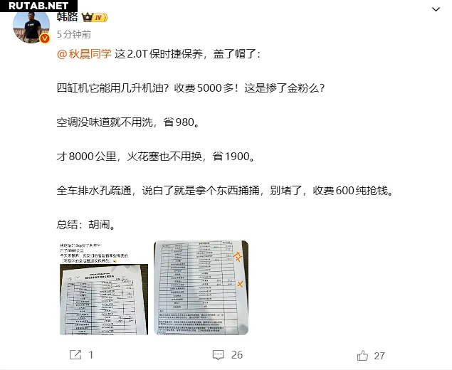 «Сколько литров масла потребляет четырехцилиндровый двигатель? За это просят больше 5000! Это что, золотая пудра? Если кондиционер не пахнет, его не нужно чистить — экономия 980 юаней; при пробеге всего 8000 км свечи зажигания менять не нужно — экономия 1900 юаней; прочистка сливных отверстий автомобиля, по сути, просто профилактика засоров, стоит 600 — чистый грабеж».