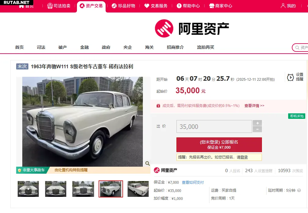 На китайской аукционной платформе Alibaba появился лот, привлекающий внимание коллекционеров — антикварный автомобиль Mercedes-Benz 1963 года выпуска. Торги начнутся вечером 11 декабря по московскому времени со стартовой цены в 35 000 юаней. На момент публикации новости за лотом следят уже 243 человека, а количество просмотров исчисляется десятками тысяч.
