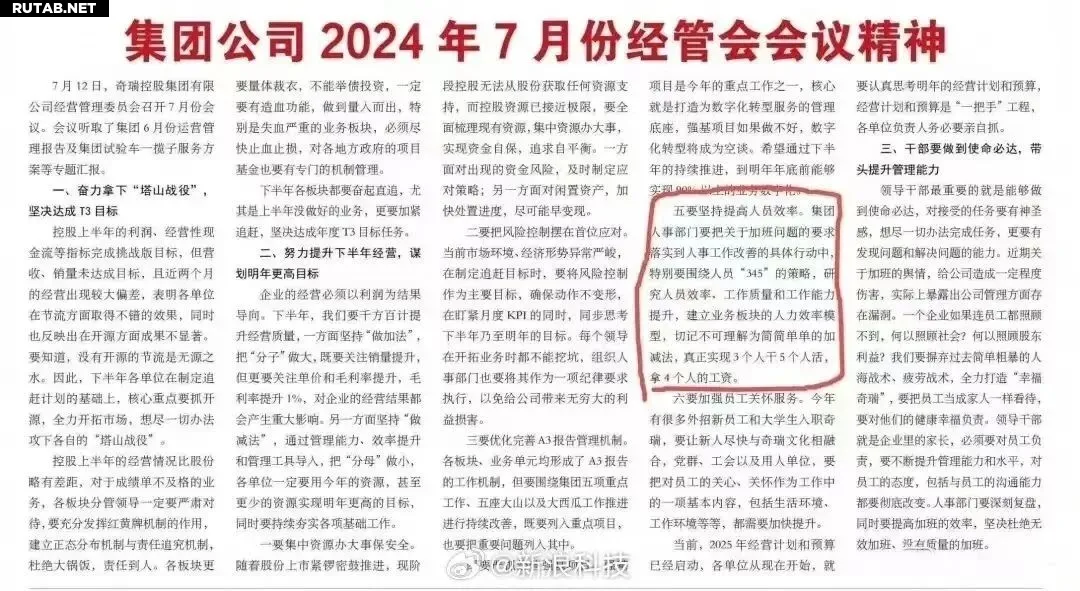 Отмечается, что культура переработок в Chery может быть связана со стратегией повышения эффективности персонала, известной как «345». Согласно внутренним документам, о которых сообщали СМИ в августе 2024 года, компания стремилась к тому, чтобы «3 человека выполняли работу за 5, получая зарплату 4 человек». Официальный представитель Chery Цзинь Ибо позднее пояснил, что это «цель в области управления эффективностью, направленная на повышение качества и эффективности работы, а не простое сокращение затрат». Однако в документах также прямо говорилось о необходимости «повышать эффективность сверхурочной работы, решительно искореняя бесполезные и некачественные переработки».