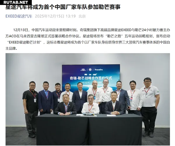 Китайский автопроизводитель Chery сделал важный шаг в автоспорте. Его премиальный суббренд Exeed (星途) и организатор знаменитой гонки «24 часа Ле-Мана» — Автомобильный клуб Запада (ACO) — подписали стратегическое соглашение о сотрудничестве.